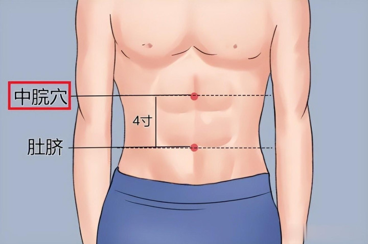 中脘穴(养胃消癥):位于上腹部,前正中线上,脐上4寸(胸骨下端和肚脐勾通线的中点)。