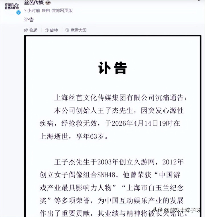 王子杰暴毙,游戏圈玩家们集体怀念,20年前他曾引颈国内游戏迅速发展,一则音信在游戏圈迅速传开,王子杰因突发心源性疾病离世,享年63岁,关于好多老玩家来说,这不仅是一位企业家的离开,更像是一个期间的注脚被悄然合上。