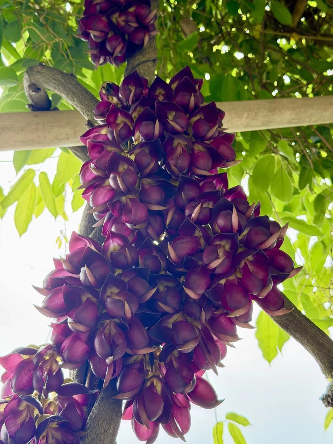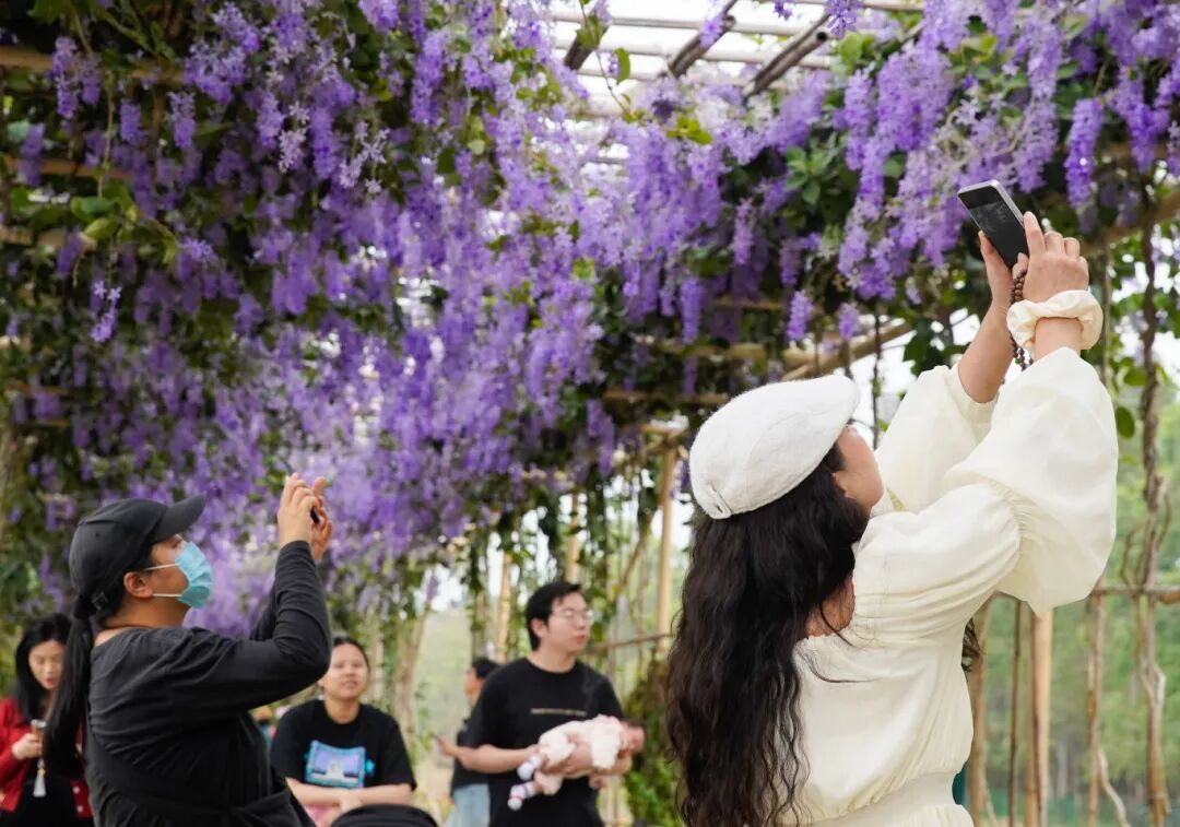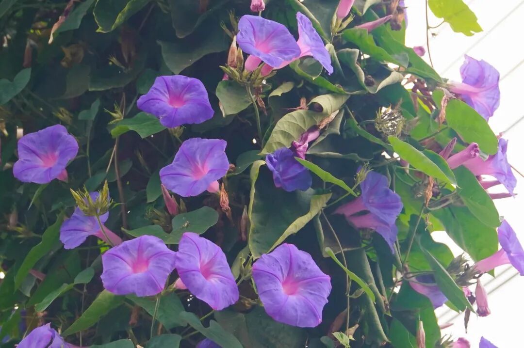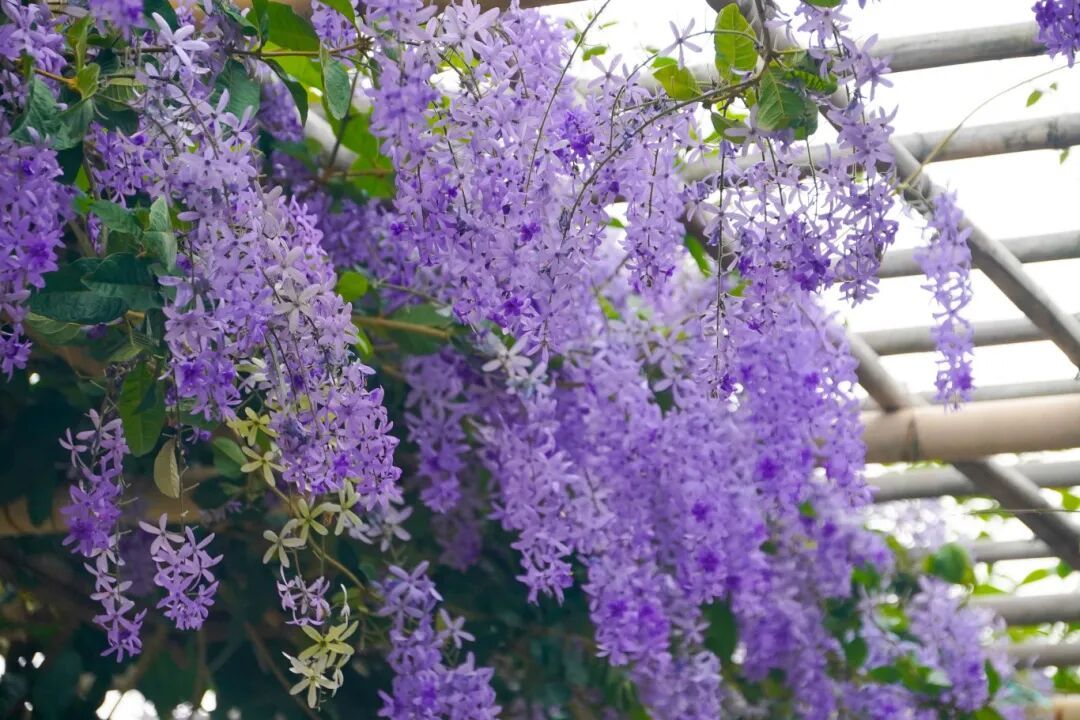 光影斑驳,微风拂过,一串串紫蓝色的蓝花藤轻轻摇曳,宛若一派柔和的紫色花海,号称长廊里的“颜值担当”。跟着时辰变化,蓝花藤还会从初开的蓝紫色渐渐变浅至淡蓝色,终末变为白色。