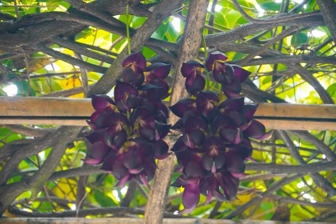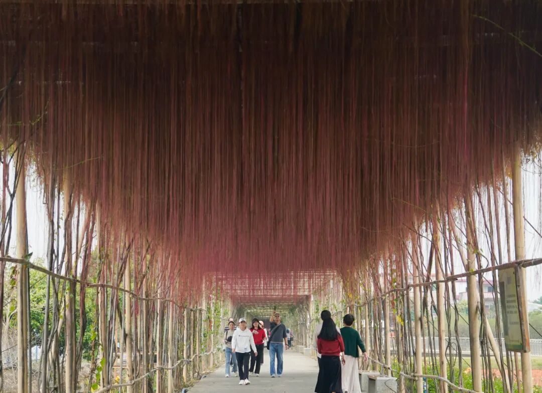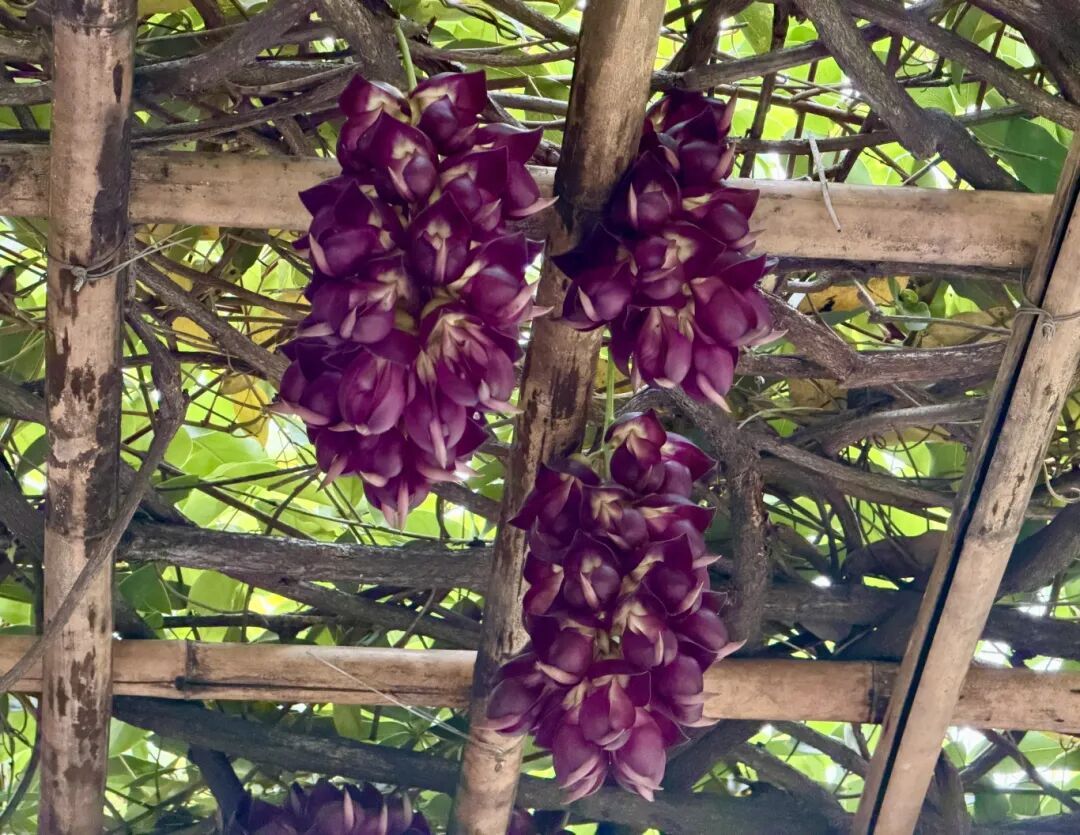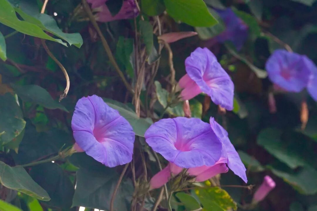光影斑驳,微风拂过,一串串紫蓝色的蓝花藤轻轻摇曳,宛若一派柔和的紫色花海,号称长廊里的“颜值担当”。跟着时辰变化,蓝花藤还会从初开的蓝紫色渐渐变浅至淡蓝色,终末变为白色。