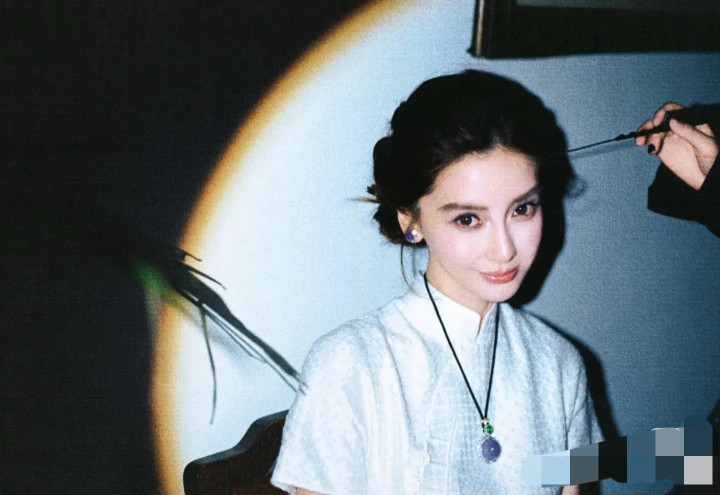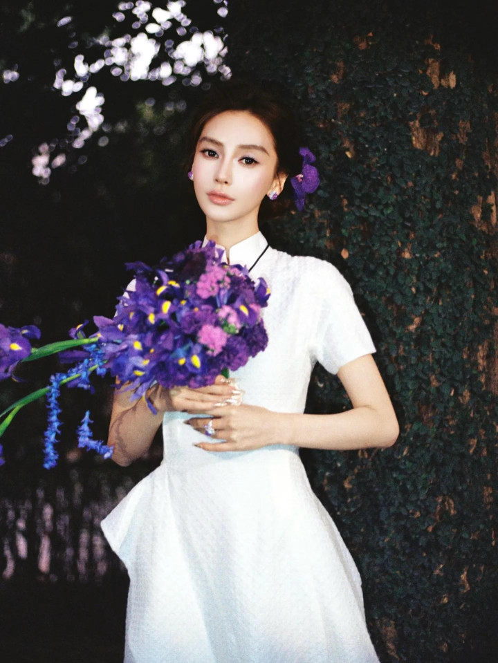 相片中她头发盘起,身穿白色的登科旗袍,脖子上还指导了一块紫色的翡翠项链,戴了紫色的耳饰和规则,就连头发上也别了一朵紫色的花作念遮拦。