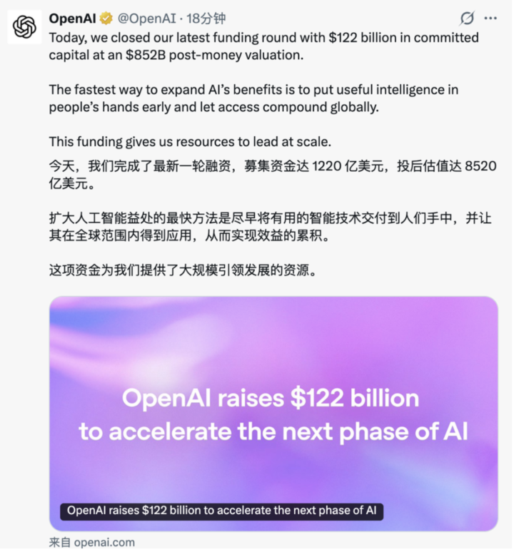 单轮私募 1220 亿,东说念主类交易史上从未有过。融资完成后,OpenAI 的估值落在 8520 亿好意思元,距离万亿只差一步,而这家公司成就于今才十年。