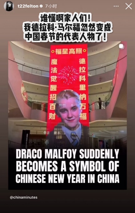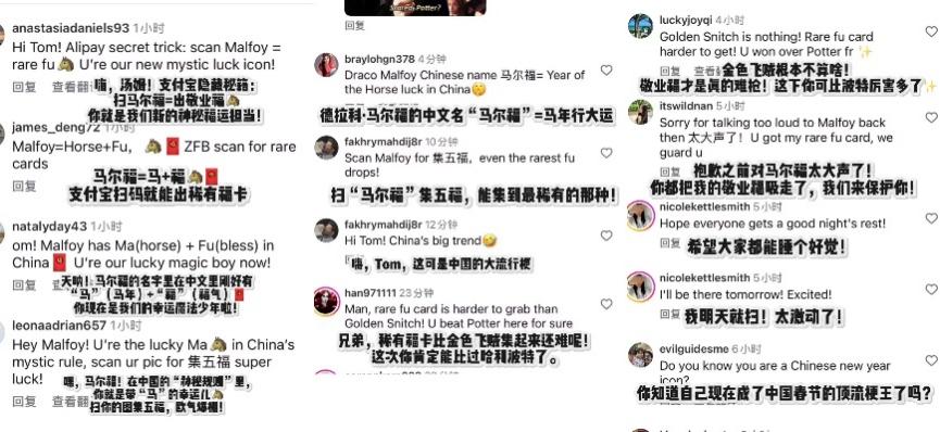 记者注意到,《哈利·波特》里的经典角色“马尔福”因为名字里有马也有福,被中国网友玩梗求卡重新走红社交媒体,不少网友称扫马尔福扫出了稀有卡。马尔福扮演者汤姆·费尔顿的ins评论区也挤满了排队求福卡的中国网友,或因网友评论引发了本人关注,费尔顿本人亲自下场玩梗晒图。