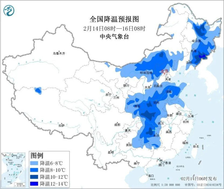 中央气候台2月14日6时发布寒潮蓝色预警。瞻望14日至16日,我国中东部大部地区气温将自北向南下落6℃至10℃,内蒙古中部、东北地区中东部、黄淮西部、江汉北部、江南中西部等地下落10℃至12℃,局地降温可达14℃以上。2月17日凌晨最低温度0℃线将南压到江淮、黄淮中南部至陕西西南部一带。