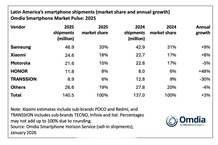 小米以18%份额排行第二,在阿根廷、哥伦比亚等地增长显贵,Redmi A5等机型鼓动出货量翻新高。